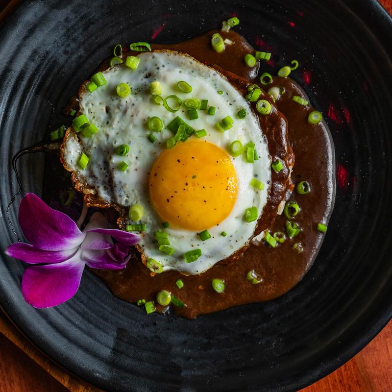 8 oz Angus beef patty, topped with house gravy and sunny egg, over sushi rice.