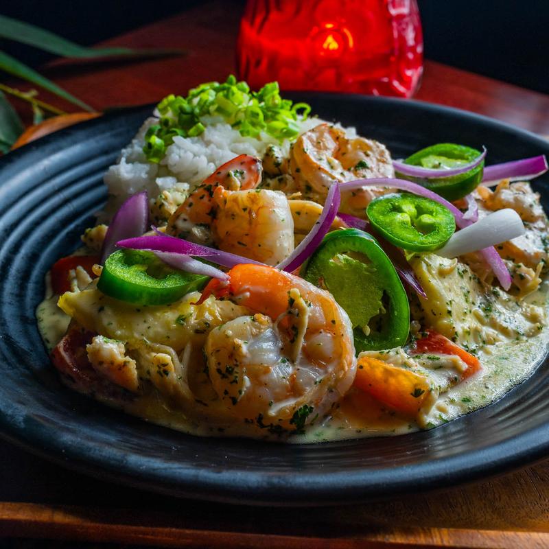 Spicy, traditional green curry with veggies and green onion| Add Chicken, Pork, or Veggies +$6.00 | Add Seafood: $8 for Shrimp, Salmon, or Ahi Poke, Hawaiian Fish-MKT$ GF. Can be made Vegan.